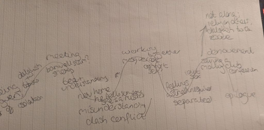 So the Big Events tee-em, the happies and angries go on the peaks, and then calmer or sadder bits in the troughs. It should also in general grow throughout the book so the greatest peak and lowest trough come at the end. But I got lazy drawing my wiggle!